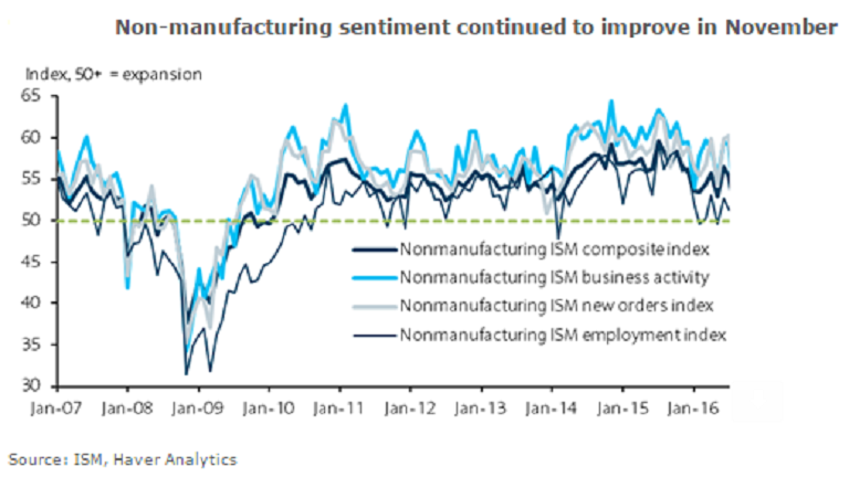 The ISM nonmanufacturing index jumped to 57.2 in November, from 54.8 in October. U.S. service providers experienced a robust expansion of business activity in November, helped by the fastest rise in new work for one year. The seasonally adjusted final Markit U.S. Services Business Activity Index registered 54.6 in November, to remain above the 50.0 no-change value for the ninth consecutive month.