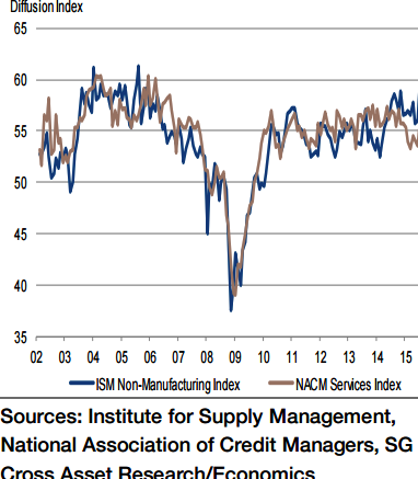 "Using data from the above surveys, the statistical model calls for a one-point dip in the Institute for Supply Management's gauge to 58.0", says Societe Generale.
