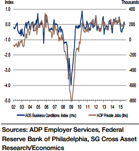 "Indeed, a solid 265K rise is expected in the ADP private payroll series, the largest gain since the end of 2014", says Societe Generale.