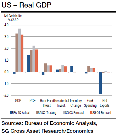 Societe Generale estimates, the real GDP growth is likely to post 3.3% growth and real consumption spending to post 2.8% in Q2. Therefore, the bank expects the real business activity probably rebounded sharply in Q2, after a weather-related contraction during the winter.