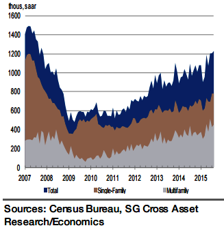 "Last month's anticipated rise is expected to be fueled by a rebound in multifamily building during the reference period. Multifamily starts likely jumped by 6.1% to 450,000, a touch above the 437,000 average posted over the May-July span", says Societe Generale.