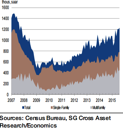 "Last month's anticipated rise is expected to be fueled by a rebound in multifamily building during the reference period. Multifamily starts likely jumped by 6.1% to 450,000, a touch above the 437,000 average posted over the May-July span", says Societe Generale.