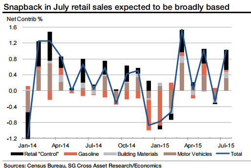 "Our estimate would place the closely followed spending metric in July 3.8% annualized above its April-June average, almost matching the 4.1% spring-quarter gain," says Societe Generale.