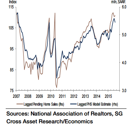 "With the number of homes on the market expected to contract by a more modest 0.9% to 2.22 million before seasonal adjustment during the reference period, the stock of unsold dwellings likely moved one tick higher to 4.9 months' supply", says Societe Generale.