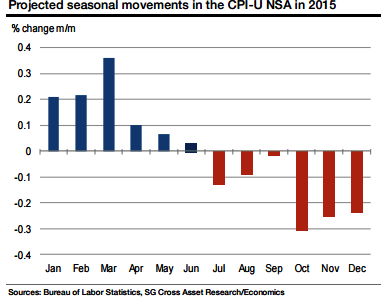 "The unadjusted CPI-U edged just 0.1% higher to 238.844 in July, following a 0.9% advance over the April-June span. Looking ahead, a 1.2% rise to 237.544 is estimated over calendar 2015 and a further 2.3% increase to 243.122 in 2016", says Societe Generale.