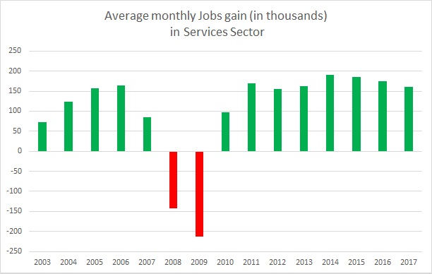 - The first chart shows average monthly job creation in the services sector and one can see that job creation is on a downward path for last few years. So far this year, Services sector created 161,000 jobs every month on an average, which is the weakest figure since 2011.