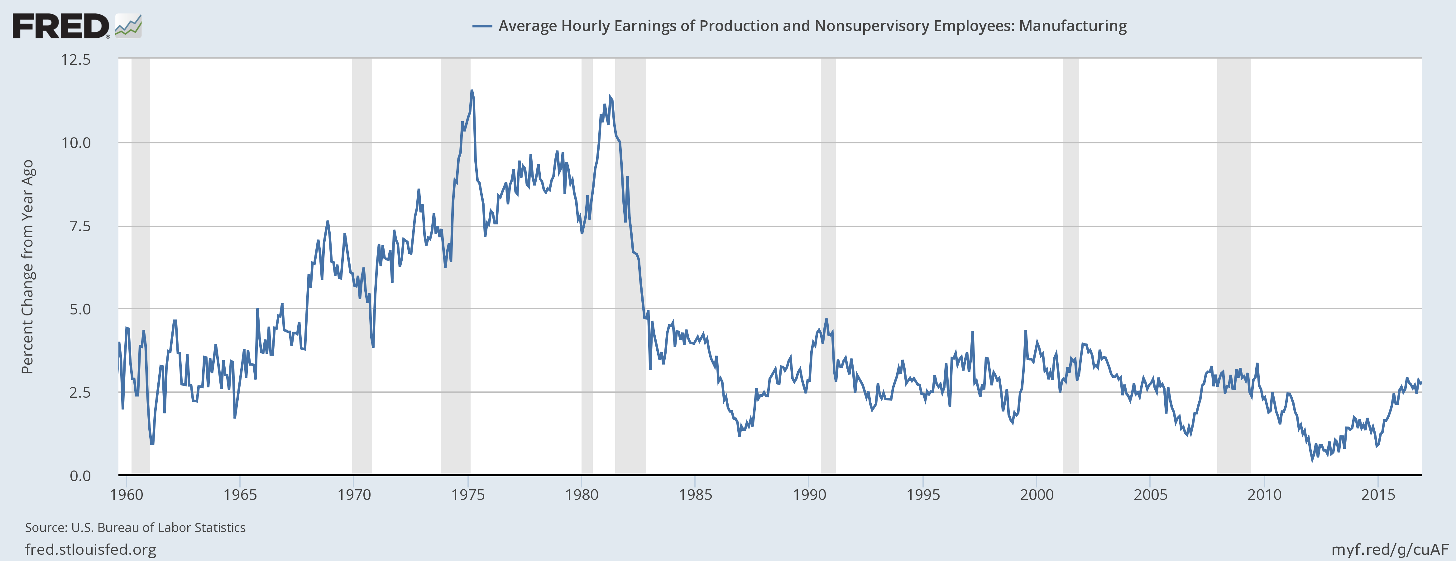 - The first chart shows the average hourly earnings of production and non-supervisory employees in manufacturing since 1960. For two decades, manufacturing wages in the United States were rising and it rose from 1.5 percent in 1960 to as high as 11 percent y/y in 1981. But after the 82 recession, wages turned stagnant and the payroll growth was below 3 percent y/y for the past three decades.