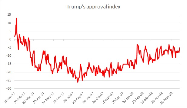 The first chart shows that after bottoming in July 2017, President Trump’s approval rating has been rising steadily, though it is still in the negative.