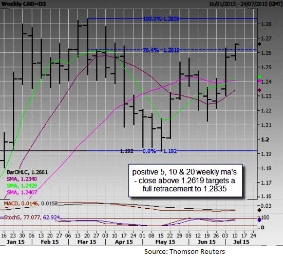 Close above 1.2619, 76.4% Fibonacci targets 1.2835 2015 high Momentum studies, 5, 10 & 20 dma's head north 1.2550 550M, 1.2600 260M & 1.2700 500M option strikes contain