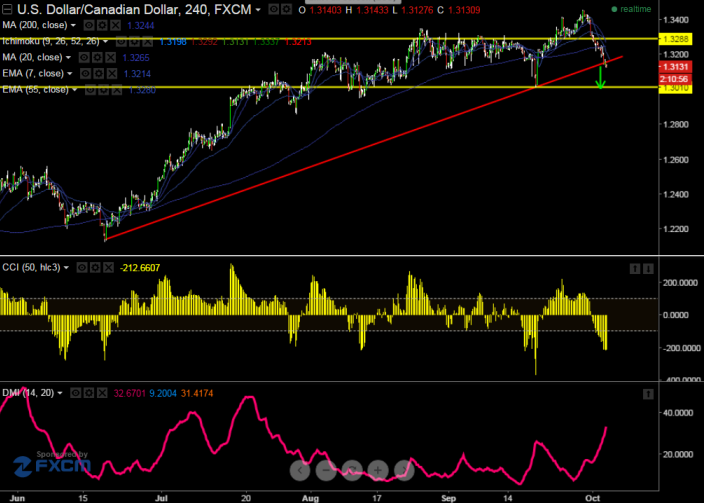 - USD/CAD has broken major trend line support at 1.3140 (trend line joining 1.2126 and 1.30113) and this confirms short term weakness, a decline till 1.300 is possible.