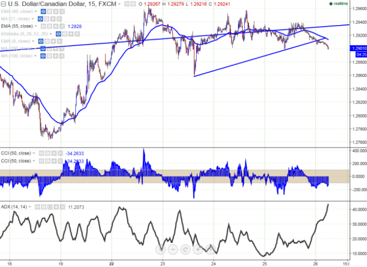 - In the 15 min chart,the pair is trading below 55- EMA and also broken the trend line support. It is currently trading around 1.29030 level.