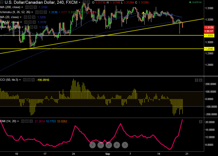- Loonie breaks short term trend line support and has declined till 1.30733. It is currently trading at 1.3137.