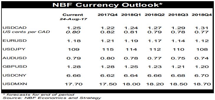 In light of the slightly more bullish call on Canada, the NBC now expect the Bank of Canada’s overnight rate to end 2018 at 1.75 percent, 25 basis points higher than in our previous forecasts. As such, we are a bit more optimistic about the Canadian dollar, now expecting USDCAD to trade in the 1.20-1.30 range over the next 12 months.