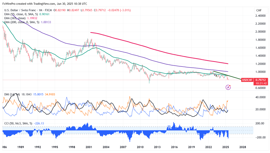 The pair is trading below the 55-EMA, 200 EMA, and 365 EMA on the monthly chart, indicating a bearish trend. The immediate resistance is at 0.8050, any break above targets 0.8090/0.8140/0.8180/0.8250/0.8300.