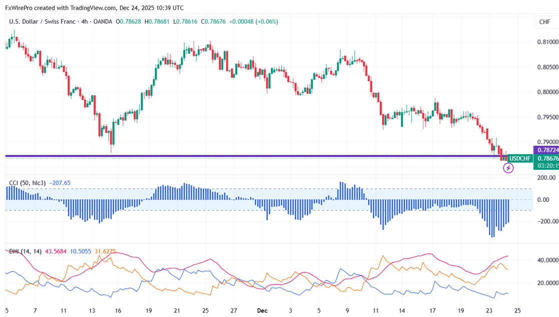 USDCHF trades below 0.7870 on board-based US dollar selling. Any breach below 0.7860 confirms further bearishness. Currently trading at 0.78662, it reached an intraday low of 0.78622.