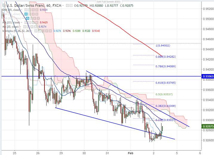 - Technically in the hourly chart, the pair is trading slightly above hourly Tenkan-Sen at 0.92766 and jumped till 0.92936. The near term intraday resistance is around 0.9300 (hourly Kijun-Sen) and any break above targets 0.9320 (trend line resistance)/0.93765 (61.8% fibo)/0.945. Minor bullishness