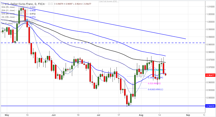 - Swiss franc gained once again after making a low of 0.97650 on Aug 16th 2017 high. The pair has formed temporary bottom around 0.95825 and nay further weakness only below that level. it is currently trading around 0.96484.