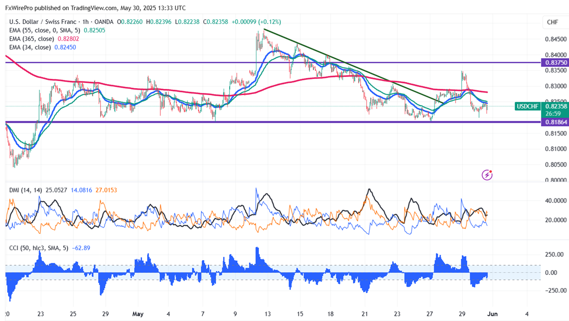 USDCHF lost its shine after US PCE data. It hit an intraday low of 0.82100 and is currently trading around 0.82277. Intraday bias appears to be bearish as long as the resistance 0.8250 holds.