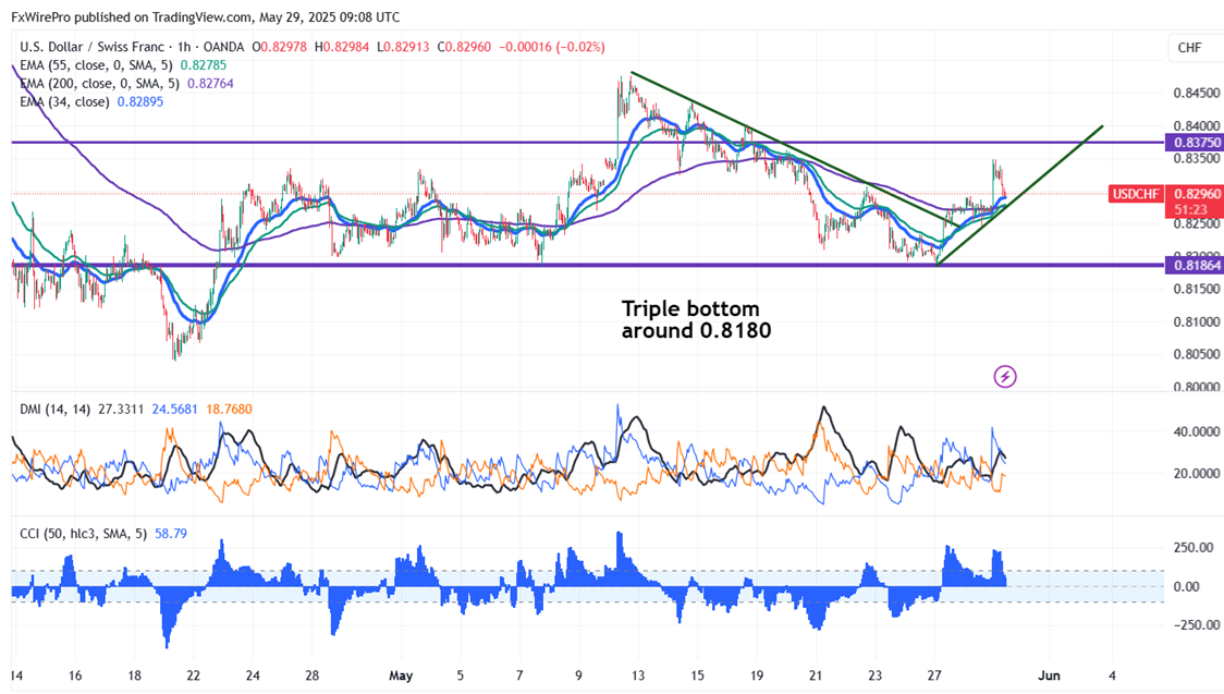 The pair is trading above the 55-EMA, below 200 EMA and 365 EMA on the 1-hour chart indicating a mixed trend. The immediate resistance is at 0.8350 any break above targets 0.8375/0.8435/0.8480.