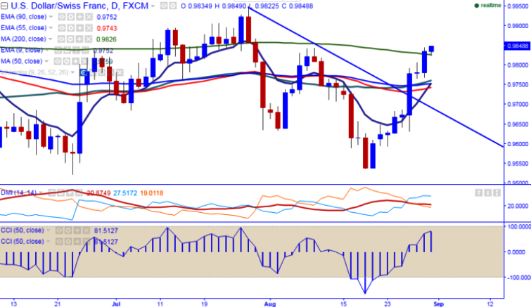 - USD/CHF has jumped above 200-day MA till 0.9844 yesterday. It is currently trading around 0.9835.