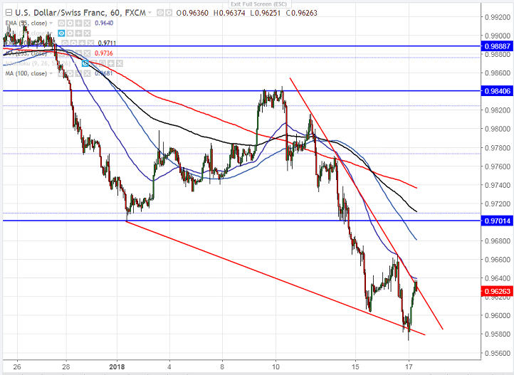 - USD/CHF has declined sharply till 0.95732 and shown a minor jump from that level. The pair declined almost 275 pips from the temporary top at 0.9845. It has recovered till 0.96385 and is currently trading around 0.96247.