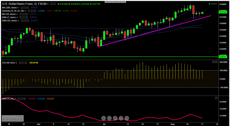 - USD/CHF has made a low of 0.9676 past week and recovered from that level. It is currently trading at 0.9775 level.