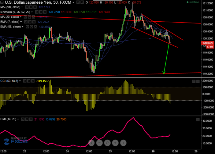 USD/JPY is facing minor channel support around 120.05 and any break below confirms intraday weakness, a decline till 119.20 is possible.