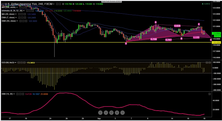 - USD/JPY has retreated till 119.69 after Fed maintains status quo. Overall trend is weak as long as resistance 121 holds.