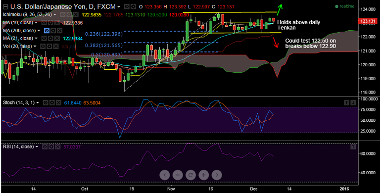 - USD/JPY fell as low as 122.99, but downside found support by daily Tenkan at 122.99, the pair has pared losses to currently trade at 123.07.
