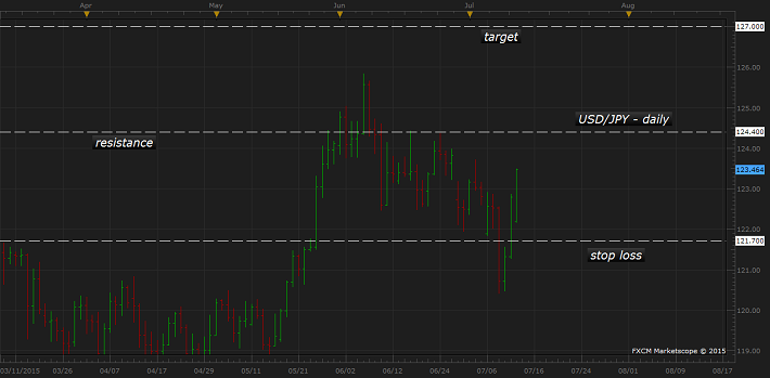 - Long dollar against Yen with stop loss at 121.7 and target of 127.