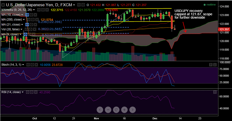 USD/JPY posting a modest recovery from an almost 200 pips slump in Wednesday's trade. The pair broke below 200 DMA and 38.2% of the Oct-Nov rise at 121.56.