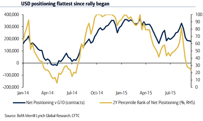 Despite the dovish response to the Fed's no-hike last week, some context on positioning is important, and could shed light on the USD's outlook. Since the USD rally began in mid-2014, stretched positioning has been a common refrain for those looking to avoid re-loading USD longs. USD long positioning is now at its lowest level since the dollar rally began.