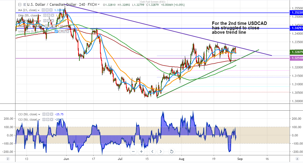 USDCAD has once again declined after showing a minor jump above the 1.3300 level. Markets eye BOC monetary policy meeting next week for further direction. The central bank is expected to keep rates unchanged at 1.75% but the chance of rate cut in the future has been increased due to ongoing trade war between US-China which is affecting commodity prices including oil. The pair hits high of 1.33180 and is currently trading around 1.32874.