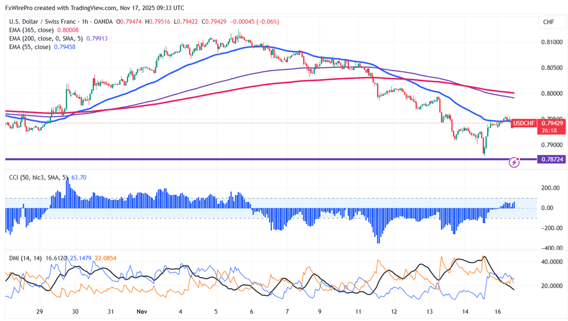 The pair is trading above the 55-EMA, below the 200-EMA, and 365 EMA on the 1-hour chart, indicating a mixed trend. The immediate resistance is at 0.7965; any break above targets 0.8000/0.8020/0.8070/0.8100/0.8150.
