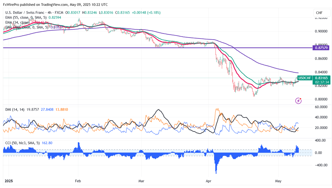 The pair is trading below the 34-EMA and 55-EMA on the 4-hour chart indicating a minor downtrend. The immediate resistance is at 0.8350 any break above targets 0.8380/0.8435/0.8500.