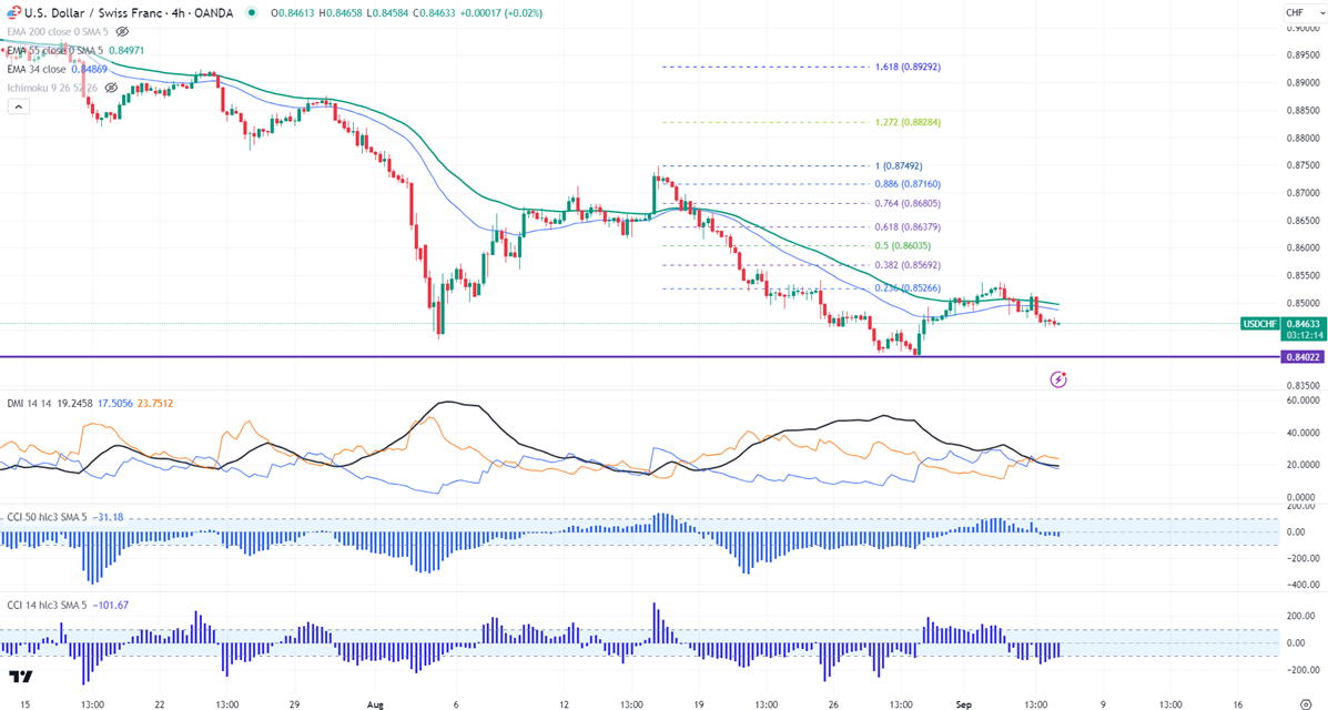 USDCHF declined after hitting a minor top of 0.85375. It hit a low of 0.84556 and is currently trading around 0.84631.