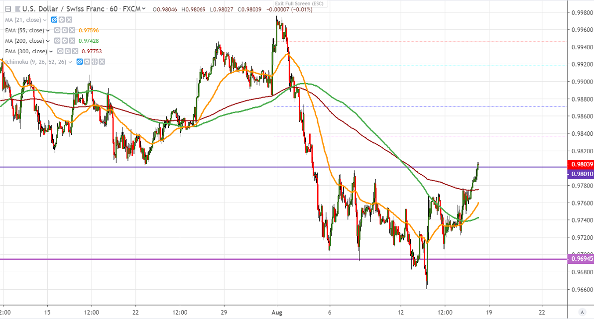 USDCHF recovered sharply and jumped nearly 150 pips from a low of 0.96598 on broad-based US dollar buying. US retail sales came at better than expected with 0.7% m/m compared to forecast of 0.3%.US dollar index trades higher and is holding above 98 levels. In the short term, it is expected to reach 98.93 high made on Aug 1st, 2019.