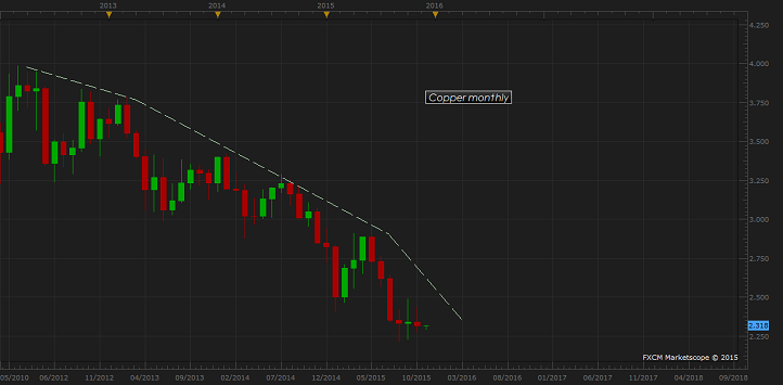 Technical picture suggests, there are lot of uncertainty regarding next major move. Copper has been posting doji like candles in monthly chart suggesting lack of clarity and it seems like only a fundamental shift such as rate hike by US Federal Reserve or further weakness (sharp) in China might tilt the balance.