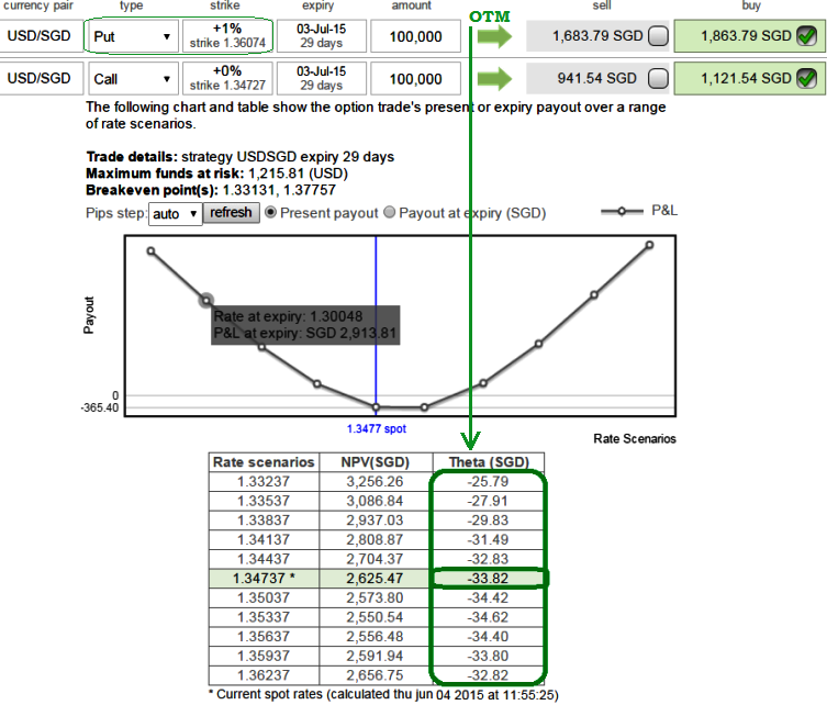 As shown in the nutshell, there is no significant change in theta value even though the underlying exchange rate oscillates dramatically. From spot 1.3473, even if it moves to any extreme directions 1.3623 or 1.3323 then Theta is not turning into positives.
