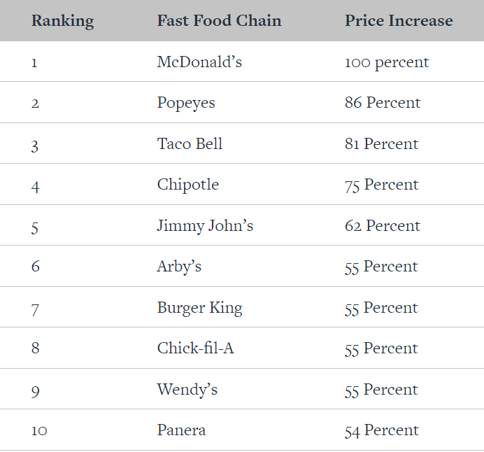 A decade ago, the financial advice website FinanceBuzz compiled data from 2014 to determine the extent to which fast food center prices have risen. Certain restaurant chains charge twice as much for an equivalent quantity of meals.