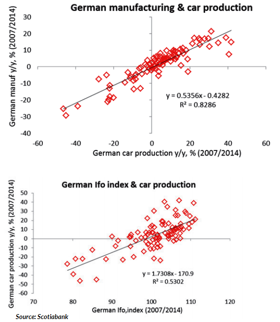 "In view of the share metrics above, we could say that the direct impact of a 10% drop in car production from Volkswagen would cut German GDP growth by around 0.15%. However, there would also likely be an additional indirect impact from the number of suppliers that also stand to suffer", notes Scotiabank in a research report.