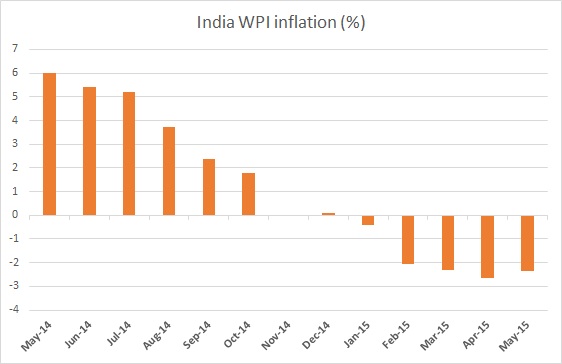 - India's WPI inflation remained in deflationary territory for five consecutive months. Whole sale prices deflated by -2.36% in May after -2.65% in April. Detailed report shows that price drop in energy segment including power by -10.5% offset the impact of food inflation, which stands at 3.8%.