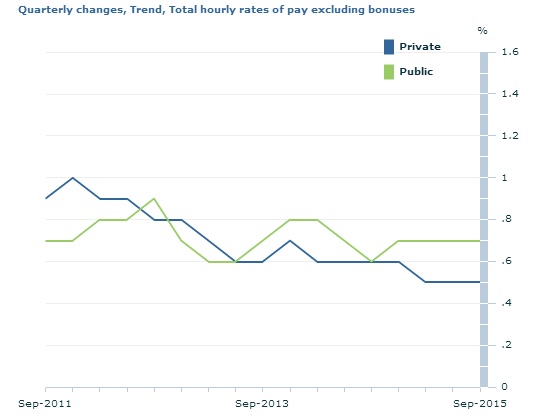 - For three months to September quarter, wages grew by 0.6% on quarterly basis and 2.3% annual pace. Annual pace of growth stands at lowest since 1998. Major contributor has been public sector, where wages grew by 2.7%. Public sector growth has been 2.1%.