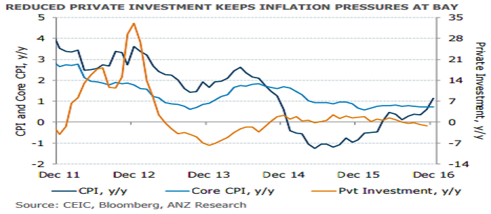 "We still expect inflation to maintain its slow rise in 2017 averaging 1.6 percent, putting it in the lower half of the central bank’s 1-4 percent target range," the report said.