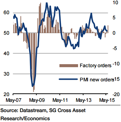 "While domestic orders are likely to have rebounded from the weak May number to record a 0.6% rise mom, foreign orders should have declined slightly", says Societe Generale.