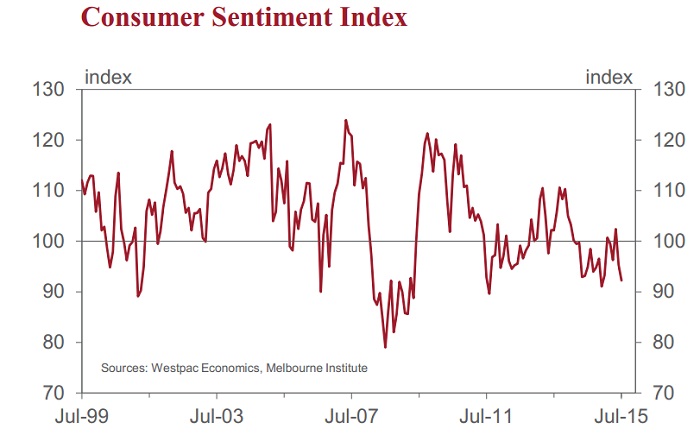 - Headline consumer sentiment index dropped by -3.2% in July to 92.2 from 95.3 in June. According to Westpac, Index is now in range, where pessimism outweigh optimism. Index has remained below 100 for 15 out of last 17 months.