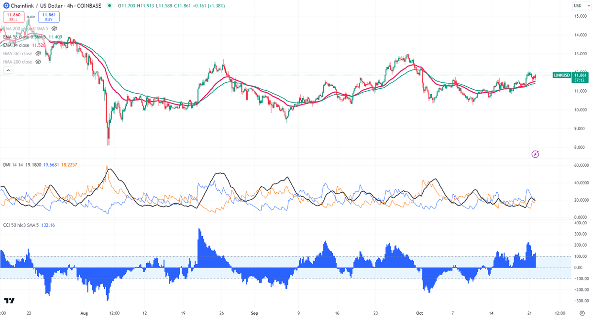 LINKUSD surged more than 17% in the past three weeks. The pair holds well above the short-term (21 and 55 EMA) and long-term moving average. It hit a high of $12.97 on Sep 28th 2024 and is currently trading around $11.82.