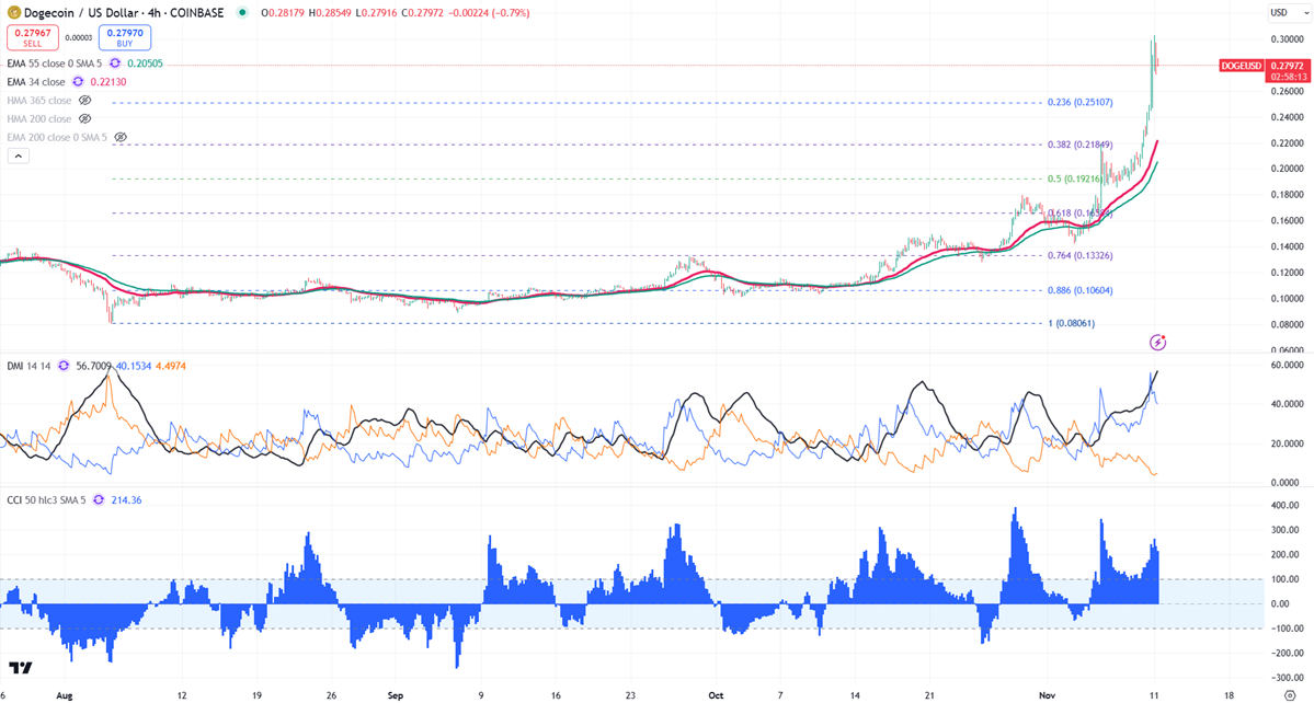 DOGEUSD showed a major jump of more than 115% in the past five days.It hits a high of $0.30294 and is currently trading around $0.16282.