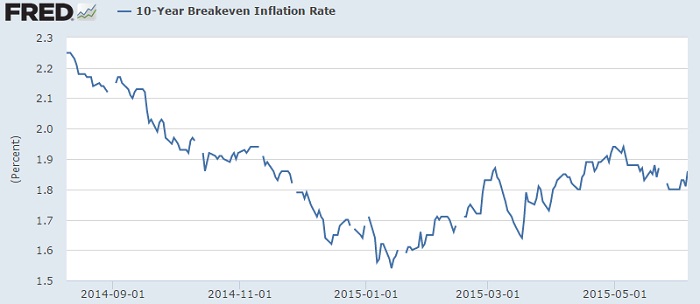 - Despite so market based measure of inflation expectations show that participants are not so confident over inflation though it can be said that deflationary pressure have subsided. 10 year break even inflation is at 1.86%, still below 1.94%, made on May 5.