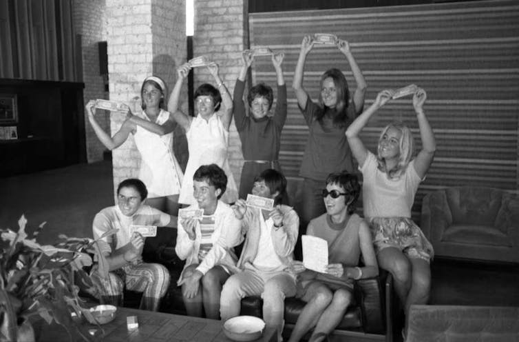 Clockwise from top left: Valerie Ziegenfuss, Billie Jean King, Nancy Richey, Peaches Bartkowicz, Kristy Pigeon, promoter Gladys Heldman, Rosie Casals, Kerry Melville and Judy Dalton. Creative Commons